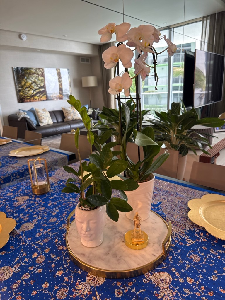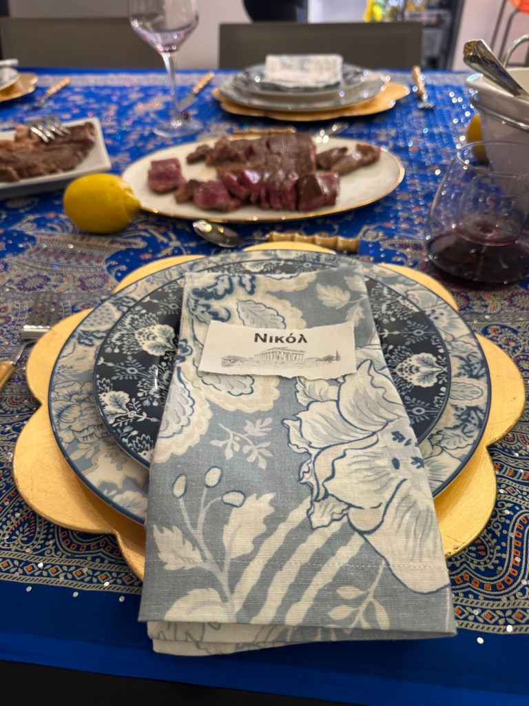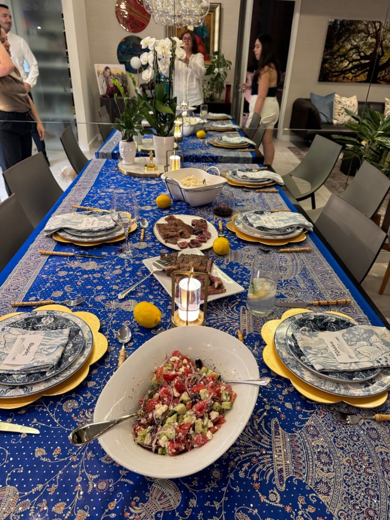 Un simple miércoles por la noche, Tommy le ofreció un Wagyu a Patty y se unieron David y Nicole. Les anuncié que iba a ser todo un banquete griego. Empecé a buscar detalles por toda la casa (¡no faltaba más!, yo soy el departamento de póngalo bonito.) Mantel hermoso, platos bases, platos azules con servilletas a juego…